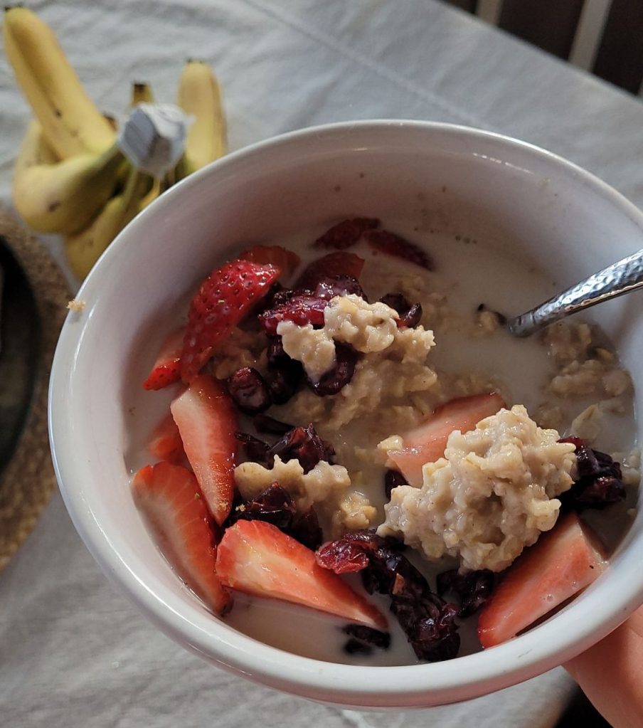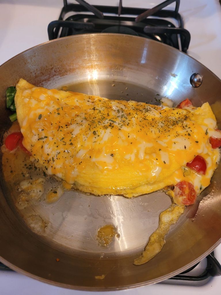 Next, I like to make a yummy-filled omelet. Add fresh spinach, tomatoes, cheese, salsa, onion, and parsley. Cut in half and share with your toddler! It can be a breakfast, lunch, or snack! Super healthy, too! Many times for breakfast, I love to cook up some oatmeal with cranberries and Ceylon cinnamon.