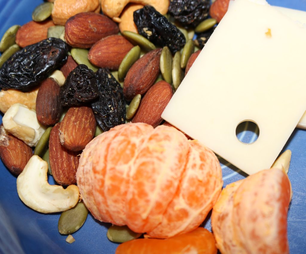 Trail mix is great, and crisp crackers are delicious with a nice crunch. I love to snack on cutie oranges, with sliced Swiss cheese, and trail mix consisting of almonds, cashews, raisins, and pumpkin seeds.