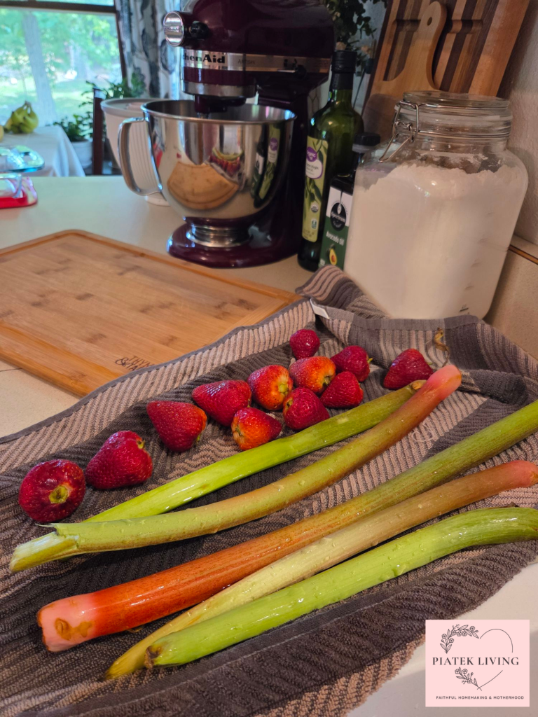 When your neighbors give you rhubarb, you have a reason to make crisp! Tart, sugary dessert but filled with antioxidants and more! Rich in vitamin K, fiber, calcium, potassium, and even manganese. I love to eat with the seasons. Rhubarb is a lovely sweet to wait for each year. It pairs great with vanilla ice cream. Yum! You could make the rhubarb on its own, or you can add strawberries. Since I didn’t have as much rhubarb, I decided to add in strawberries to get about 6 cups of fruit including the rhubarb.