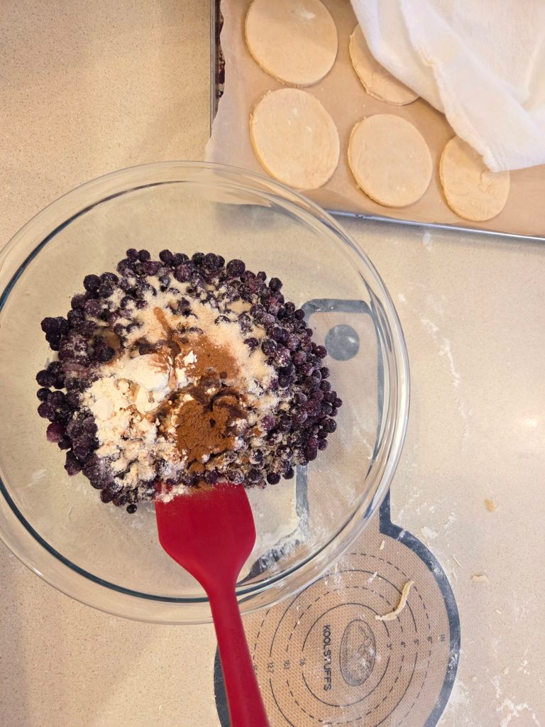 Put a cloth over the cut-out pierogi rounds as you work so they don’t dry out. Next fill them and fold in half-moon shapes. I use this cut out to make them https://amzn.to/3NGYep2. Pinching and dipping your finger in warm water if needed to help close up the pierogi.